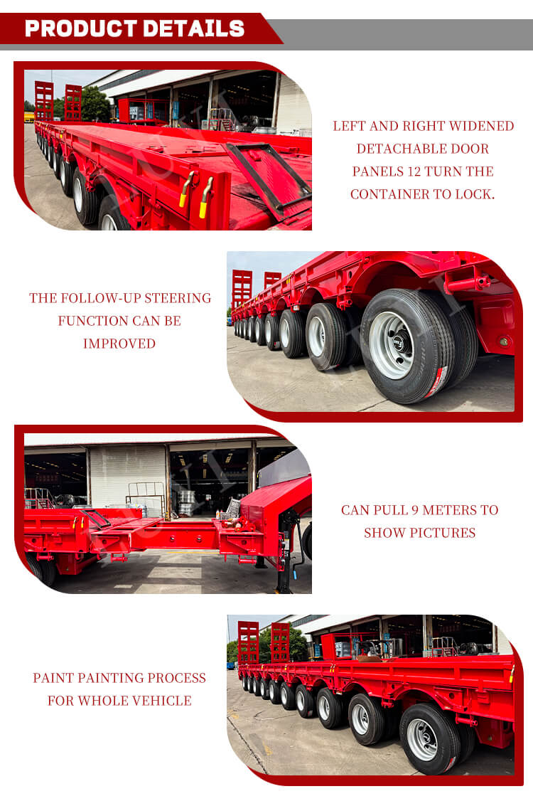 Přívěs je vybaven zesílenou konstrukcí pro 10 náprav a ve spojení se vzduchovým nebo listovým odpružením poskytuje vynikající jízdní stabilitu. Pevná konstrukce husího krku zajišťuje spolehlivou trakci, zatímco hydraulický nebo ruční žebřík usnadňuje nakládání a vykládání nákladu. Standardně se dodává s 28tunovým podvozkem pro stabilní a odolnou podporu a barvu lze přizpůsobit podle potřeby. Díky svému vynikajícímu konstrukčnímu provedení a přísné kontrole kvality je vhodný pro přepravu těžkých nákladů, jako jsou velká zařízení a strojírenské komponenty, a poskytuje efektivní a bezpečné řešení pro logistický a dopravní průmysl.