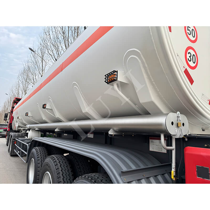 S rozměry 12 500 × 2 500 × 3 600 mm je tělo nádrže vyrobeno převážně z oceli a podle potřeby lze spárovat i s materiály z uhlíkové oceli nebo slitiny hliníku. 3 nápravy jsou pečlivě vybírány od známých značek včetně CIMC Dongyue, FUWA a BPW a jsou sladěny s mechanickým odpružením pro zajištění jízdní stability. Klíčové komponenty jsou dobře vybaveny: 28tunové standardní podpěrné nohy JOST poskytují stabilní podporu; královský čep má volitelné modely JOST 2 palce (50 mm) nebo 3,5 palce (90 mm); pneumatiky nabízejí tři specifikace jako 12R22.5; 90×13×10vrstvé listové pružiny zvyšují nosnost. Kromě toho lze barvu upravit podle potřeb zákazníka a přizpůsobit se různým scénářům přepravy.