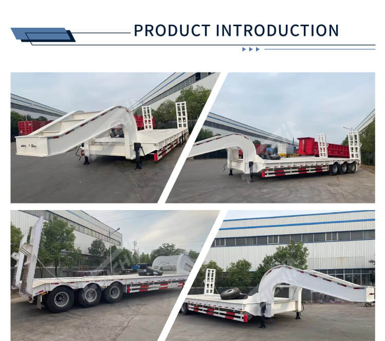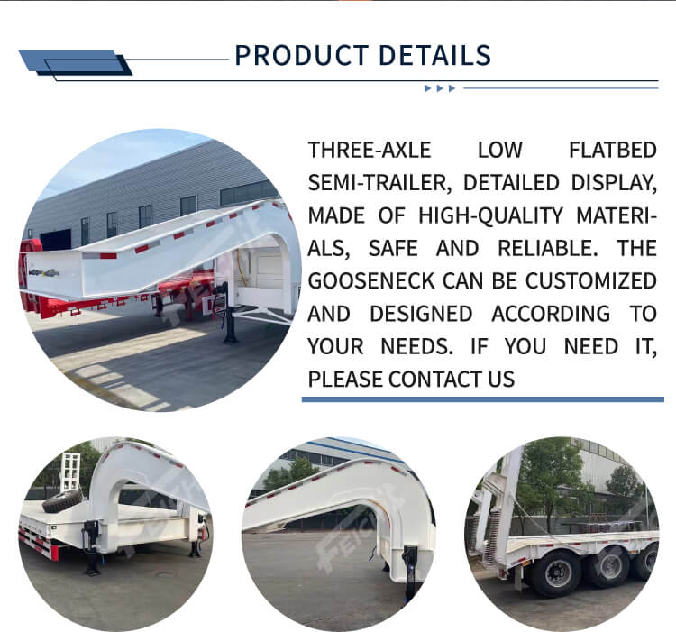 Je vyrobena z vysoce kvalitní oceli a má rozměry 17000×3000×1500 mm, což zajišťuje dostatek prostoru pro náklad. Je vybaven 4 nápravami pro silnou nosnost, s volitelným vzduchovým nebo listovým odpružením, které zaručuje stabilní jízdu a účinnou ochranu nákladu. Odnímatelný design husího krku zvyšuje flexibilitu nakládání, zatímco možnosti hydraulického nebo ručního žebříku zjednodušují nakládání a vykládání těžkého vybavení.