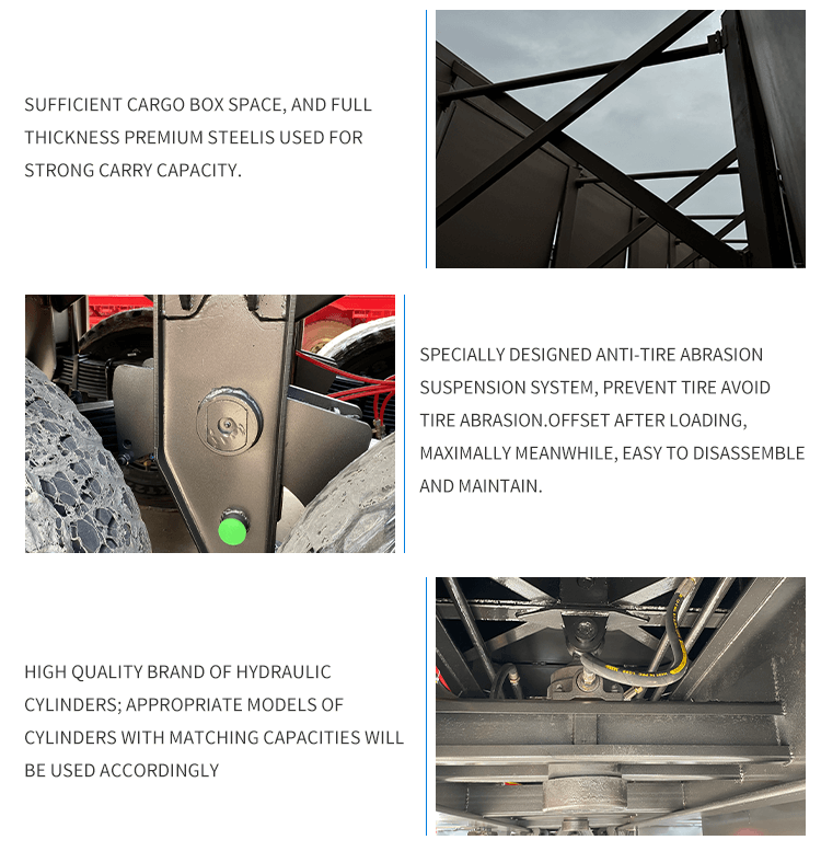 S rozměry 11 000 x 2 500 x 3 500 mm a maximálním užitečným zatížením 25 001-30 000 kg efektivně splňuje požadavky na velké zatížení. Je vybavena mechanickým odpružením, listovými pružinami 90(W)mm×13(Thickness)mm×10(Layer) a dvouřadým brzdovým systémem pro stabilní a bezpečný provoz. Standardní 28tunový podvozek a 2"(50mm)/3,5"(90mm) královský čep JOST zvyšují přizpůsobivost. Barvu a logo lze přizpůsobit, což z něj činí všestrannou a spolehlivou volbu pro potřeby těžké přepravy.