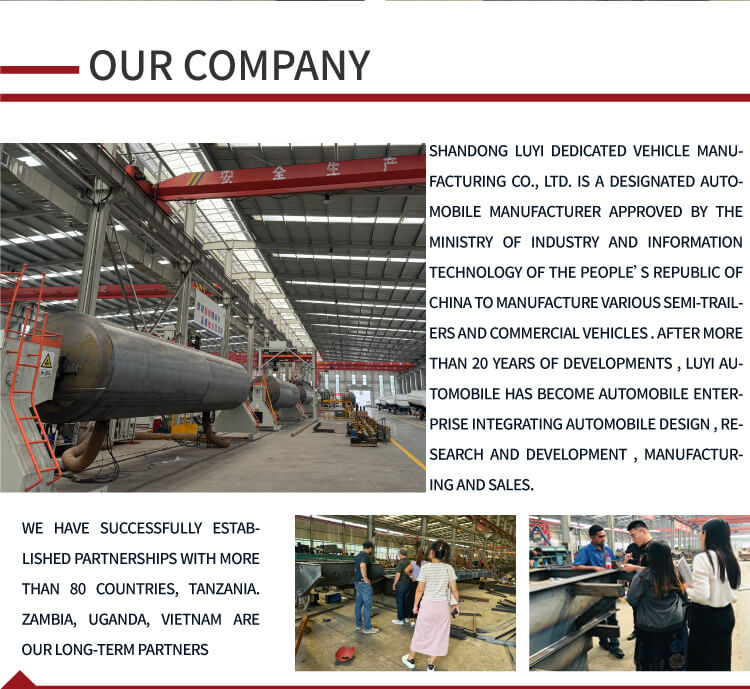 -Naše továrna:Shandong Luyi Vehicle Co., Ltd. je jedním z kvalifikovaných výrobců různých přívěsů, jako je podvalníkový návěs, valník, nákladní přívěs, skeletový kontejnerový návěs, 50ft valník atd. Díky vysoce standardním strojům a automatickým zařízením, výkonným týmem pro výzkum a vývoj a elitním prodejním týmem jsme vybudovali dlouhé obchodní vztahy s mnoha světově proslulými podniky, jako jsou SINOTRUK, SHACMAN atd.