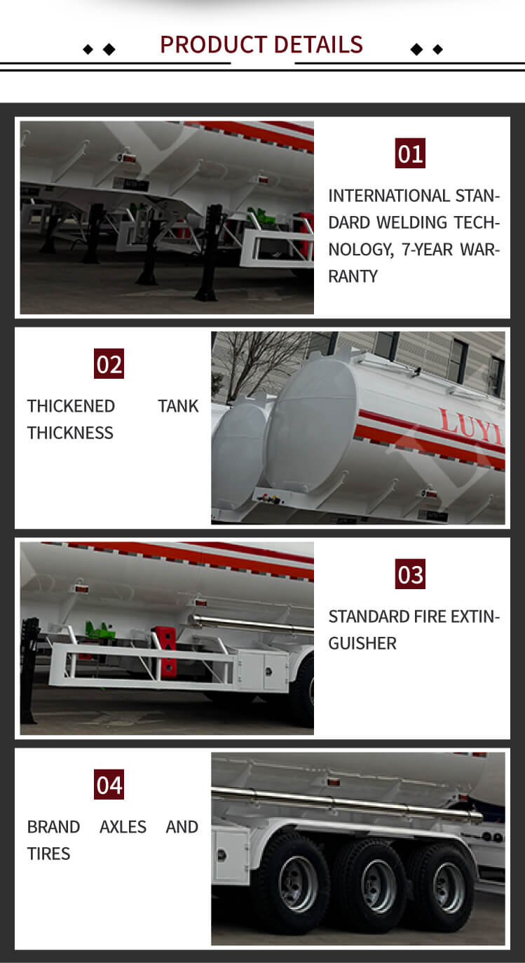 Třínápravový 45 000litrový cisternový návěs z uhlíkové oceli Luyi pocházející z provincie Shandong v Číně je vysoce účinný nákladní přívěs určený pro přepravu kapalin, jako je nafta, benzín, ropa a ropa. Jeho objem se může flexibilně pohybovat od 35 000 l do 50 000 l, přičemž se přizpůsobí různým scénářům přepravy.