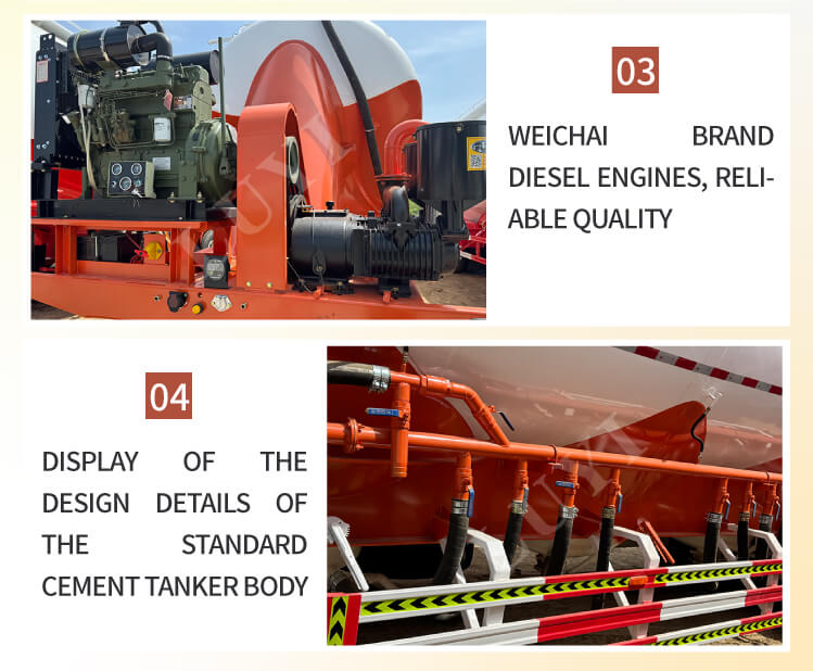 Přívěs je vyroben z vysoce kvalitní oceli a využívá 16# kanálovou ocel pro boční nosníky, což zajišťuje pevnou a odolnou konstrukci. Jeho maximální efektivní užitečné zatížení přesahuje 30 000 kg a nosnost se pohybuje od 30 tun do 60 tun, což snadno pokryje potřeby různých přepravních objemů. Vybavený 3-nápravovou konstrukcí, pneumatikami 12R22.5 a ráfky 9.00-22.5, spárované s mechanickým vzduchovým odpružením, zajišťuje stabilní jízdu a přizpůsobuje se různým podmínkám vozovky. Standardní 28tunový podvozek zaručuje pevnou oporu při parkování. A co víc, přichází s 6letou záruční dobou, která komplexně snižuje obavy z používání a poskytuje spolehlivou a dlouhodobou podporu zařízení pro hromadnou přepravu cementového prášku.