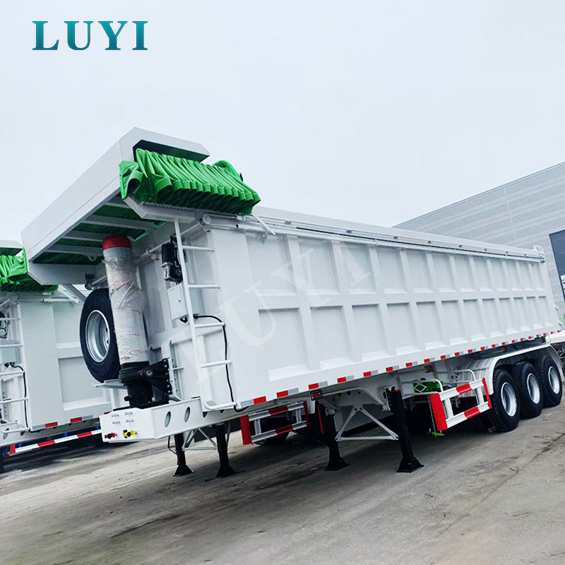 Bílý 3nápravový zadní sklopný sklápěcí návěs značky LUYI značky LUYI, pocházející z vysoce kvalitní výroby v čínském Shandongu, je účinný nákladní přívěs speciálně navržený pro přepravu těžkých nákladů. Výrobek je vyroben z vysoce pevné oceli, vyznačuje se stabilní a odolnou konstrukcí. Má rozměry 1300 mm × 2500 mm × 4000 mm a maximální nosnost 100 tun, takže snadno pokryje potřeby přepravy různého těžkého zboží.