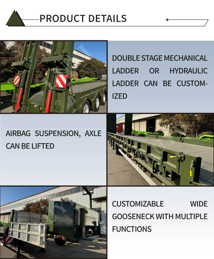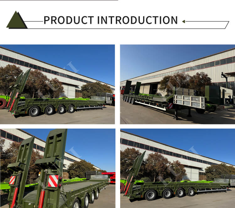 Vybavený 4 nápravami FUWA 13t a mechanickým odpružením ve spojení s pneumatikami 12R22,5 zajišťuje přívěs stabilní provoz a vysokou nosnost. Má standardní 28tunový podvozek a volitelné 90#/50# královské čepy pro spolehlivé spojení s traktory. Barvu lze přizpůsobit podle potřeb zákazníka, kombinuje praktičnost a personalizaci. Ať už pro přepravu velkých strojů nebo těžké techniky, tento přívěs je spolehlivou volbou s vynikajícím výkonem a solidní kvalitou.