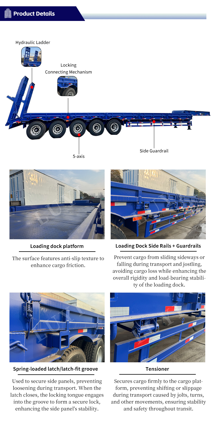 Je vybaven prémiovými komponenty a obsahuje 13tunové nápravy Fuwa/BPW spárované se systémem vzduchového odpružení, které zajišťují mimořádnou jízdní stabilitu a tlumení nárazů. Jost 28tunový dvourychlostní podvozek umožňuje efektivní zvedání a spouštění. Zákazníci si mohou vybrat z možností pneumatik včetně 315/80R22.5, 12R22.5 a 11.00R20, aby vyhovovaly různým podmínkám vozovky. 24V LED osvětlovací systém poskytuje jasné osvětlení s nízkou spotřebou energie a barvu karoserie lze přizpůsobit individuálním požadavkům. Tento návěs, podporovaný spolehlivou kvalitou Luyi, poskytuje důvěryhodné řešení pro těžkou přepravu pro globální klienty.