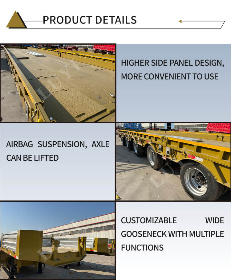 Přívěs je vybaven spolehlivým vzduchovým odpružením pro stabilní jízdu, spárovaným s nápravami 13/16 Ton Fuwa/BPW/CIMC a flexibilními pneumatikami (11.00r20, 12r22.5, 315, 385). Je vybaven 28tunovým standardním podvozkem, podpěrnými nohami JOST D200T a 2,0palcovými (50mm)/3,5palcovými (90mm) královskými čepy pro bezpečné připojení k traktoru. Dvouřadý brzdový systém zajišťuje bezpečnost, barvy jsou přizpůsobitelné, což z něj činí odolnou, přizpůsobivou volbu pro těžkou přepravu.