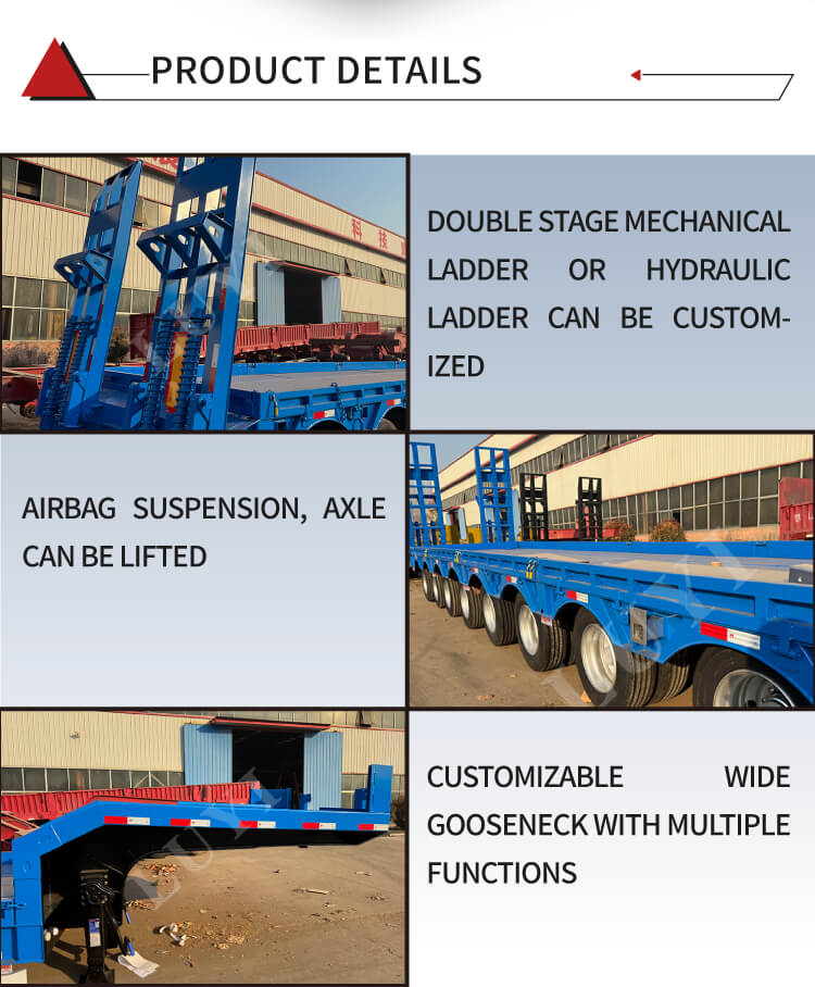 Pokud jde o konfiguraci, používá dvouřadý brzdový systém pro zajištění bezpečnosti jízdy, standardní 28tunové opěrné nohy pro stabilní podporu a čepy JOST dostupné ve variantách 2 palce (50 mm) nebo 3,5 palce (90 mm). Barvy si mohou zákazníci přizpůsobit a poskytují tak efektivní a spolehlivé řešení pro ultra-těžkou přepravu.