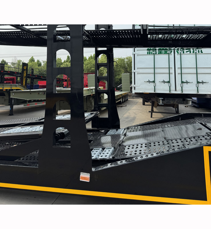 Bezpečný upevňovací systém vozidla: Každá poloha kola je vybavena profesionálními nastavitelnými zakládacími klíny a vysoce pevnými upínacími popruhy, které zajišťují, že každé vozidlo je bezpečně upevněno a zůstává během přepravy nehybné.