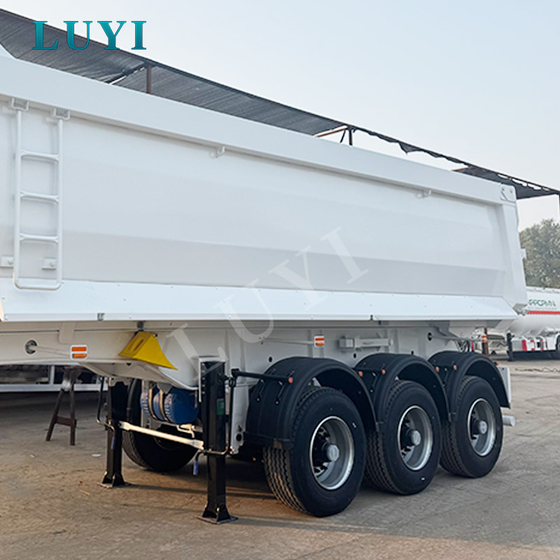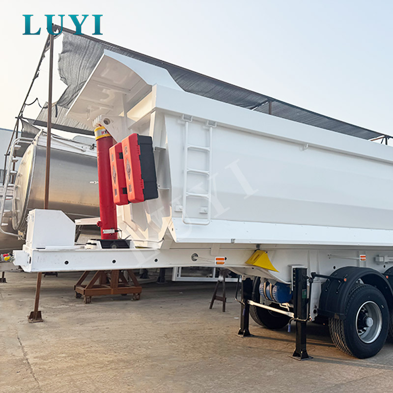 Třínápravový hydraulicky nastavitelný zadní sklápěcí návěs LUYI ve tvaru U je efektivní přepravní zařízení speciálně navržené pro přepravu materiálů, jako je písek, štěrk a obilí. Pochází z vysoce kvalitní výroby v čínském Shandongu.